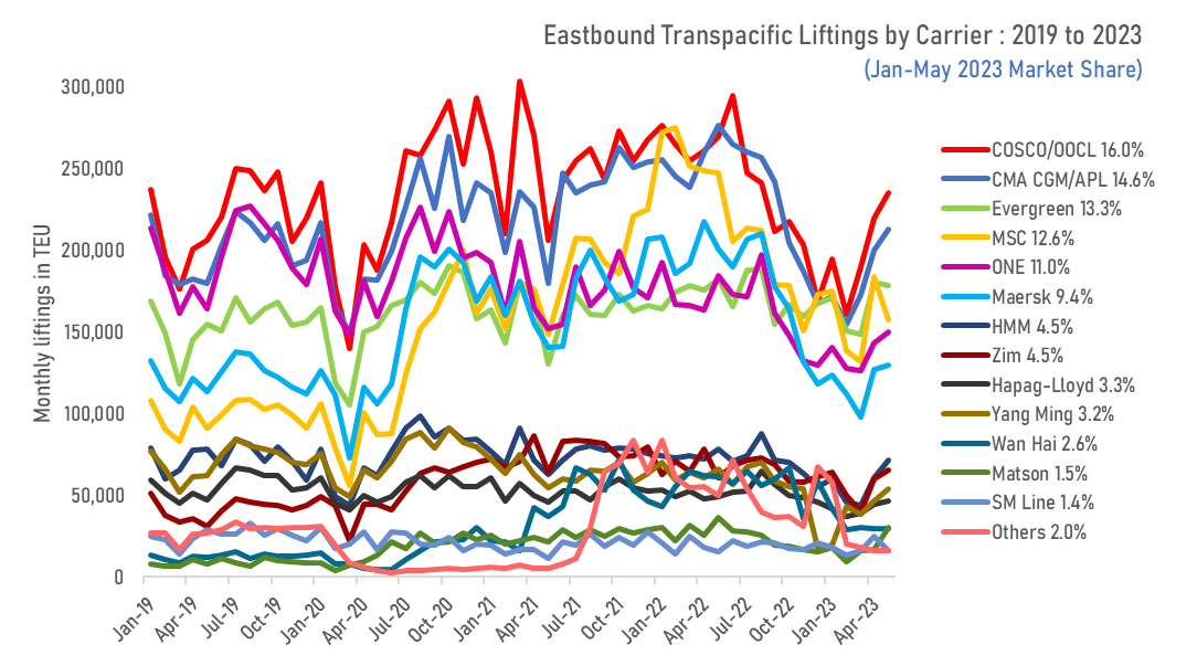 Transpacific freight rates are expected to drop further as the Asia-US trade has become the new battleground for carriers as the rate war intensifies while casualties have already started to pile up. CU Lines and Pasha are the latest carriers to exit from the trade, following the earlier departure of niche carriers such as Transfar, TS Lines, SeaLead, BAL, CIMC and Jinjiang Shipping. The micro-carriers’ share of the transpacific trade will soon drop below 1%, from a peak of 5% in December 2022. Amongst the incumbent carriers, COSCO, CMA CGM and Evergreen continue to battle for the top spot after MSC, ONE and Maersk slipped down the rankings.