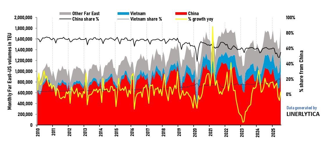 Transpacific cargo volumes rebounded sharply in July, with total Far East-US container arrivals reaching 1.810m TEU, surpassing the previous record of 1.805m TEU in January 2022. China’s share of the total volumes recovered to 55%, up from 48% in the previous 2 months. Although Vietnam’s share slipped from the peak of 20% last month to 17%, total volumes from Vietnam still reached a record high of 310,500 teu.