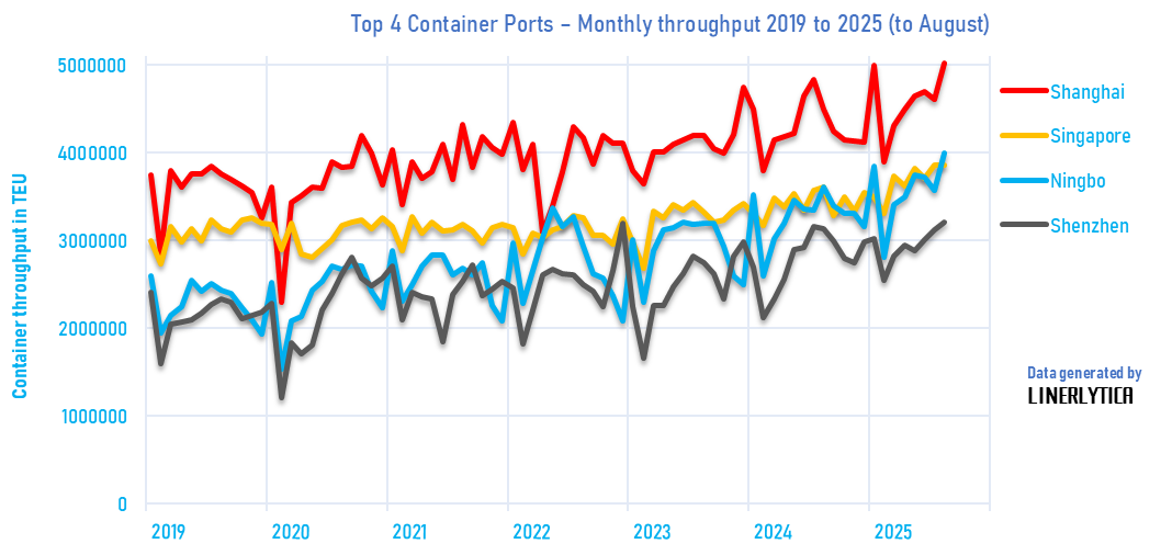 Shanghai and Ningbo recorded their highest ever monthly container throughput in August, as global container volumes have remained resilient despite the gloomy trade and economic outlook. Total volumes at the 2 largest Chinese ports exceeded 5m teu and 4m teu respectively in the past month and continue to defy the impact of the US tariffs, with significant growth recorded on the Intra-Asia, Indian subcontinent, Latin America and Africa routes.