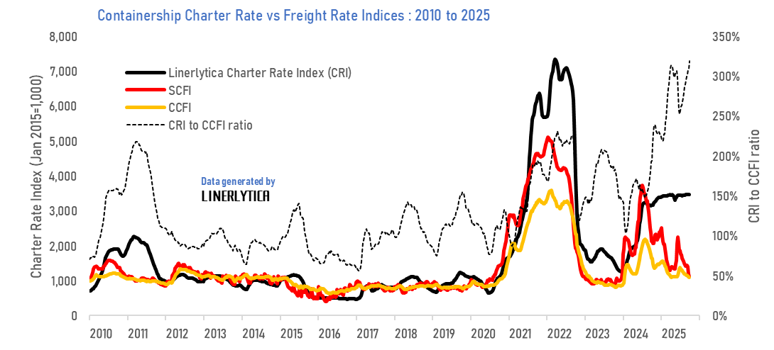 The SCFI and CCFI have slipped by 70% and 50% respectively since their 2024 peaks, but Linerlytica’s Charter Rate Index (CRI) has continued to rise throughout this period. The CRI to CCFI ratio has reached a record high of 318%, but charter rates and second hand prices show no signs of weakening as carriers continue to chase after tonnage in an early warning that capacity management remains elusive.