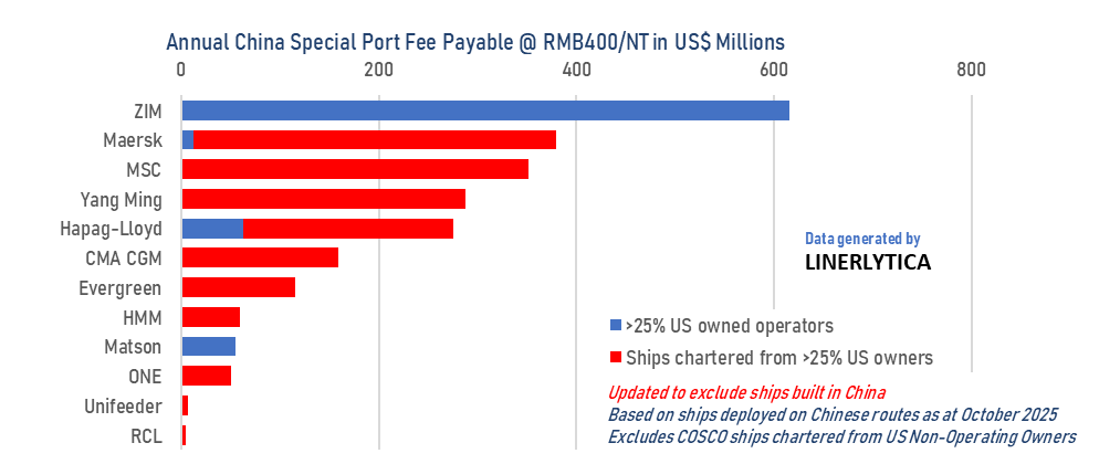 The Special Port Fee casts a wider net than initially expected as it would include companies that have over 25% US equity interests that could encompass Zim as well as ships chartered from non-operating owners such as Seaspan, SFL, Navios, Costamare and Global Ship Lease. In a notice issued on 14 October, the MOT announced that ships built in China are exempt. With this revision, the total fees payable would be reduced from $3.9Bn to $2.3Bn in the first year but the move may still trigger significant disruptions as carriers try to shift some of their chartered ships out of Chinese ports or rationalize services to minimize the impact as average voyage costs will rise by over $300/teu for the affected ships.