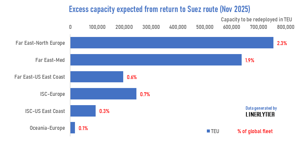 If all the containerships currently on the Cape route are redirected to the Suez, it could release over 130 ships with a total capacity of 1.95m TEU or 5.9% of the global fleet which would trigger severe disruptions to the freight and charter markets.