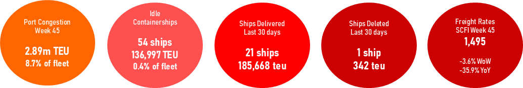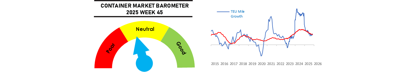 Freight rates are softening again, reversing part of their mid-October gains after the 1 November GRI flopped as weakening slack season cargo volumes provided little rate support in the absence of capacity cuts by the carriers. Transpacific rates are coming under the most pressure due to rampant rate cutting by carriers unable to fill their ships but still reluctant to pull out capacity. Latest import data shows transpacific cargo volumes falling by 8.6% in the last 2 months. European rates are holding out better with persistent port congestion capping trade capacity and keeping utilization rates at healthier levels compared to the Pacific trades.