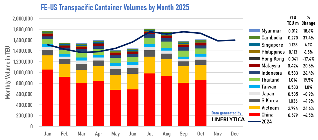 Container traffic from the Far East to the US Transpacific volumes fell by 7.2% YoY in October following a 10.0% YoY drop in September. Volumes are starting to stabilize after the initial turbulence since import tariffs into the US were first announced in April this year, with the softening trend expected to continue into November and December. Although YTD volumes through October remains positive at 2.1% due to front loading during the first 4 months of this year and a strong rebound in July and August, full year volumes are expected to grow by just 0.4% and will remain largely flat for most of 2026. China’s share of Transpacific volumes has dropped with total volumes dropping 6.5% YTD while Southeast Asian origins have gained by 23.0% with Vietnam the main beneficiary.
