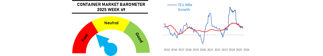 Market headwinds persist with freight rates still slipping in early December after carriers failed to push through their planned GRIs ahead of the crucial decision whether to make an early return to the Suez route. Regardless of the carriers’ near-term moves, TEU-mile demand continues to trend below supply growth and a looming multi-year over-supply problem is developing. Carriers continue to push ahead with their fleet expansion goals, raising the total orderbook to a new record high of 11.5m TEU with 4.5m TEU scheduled for delivery in 2028 alone.