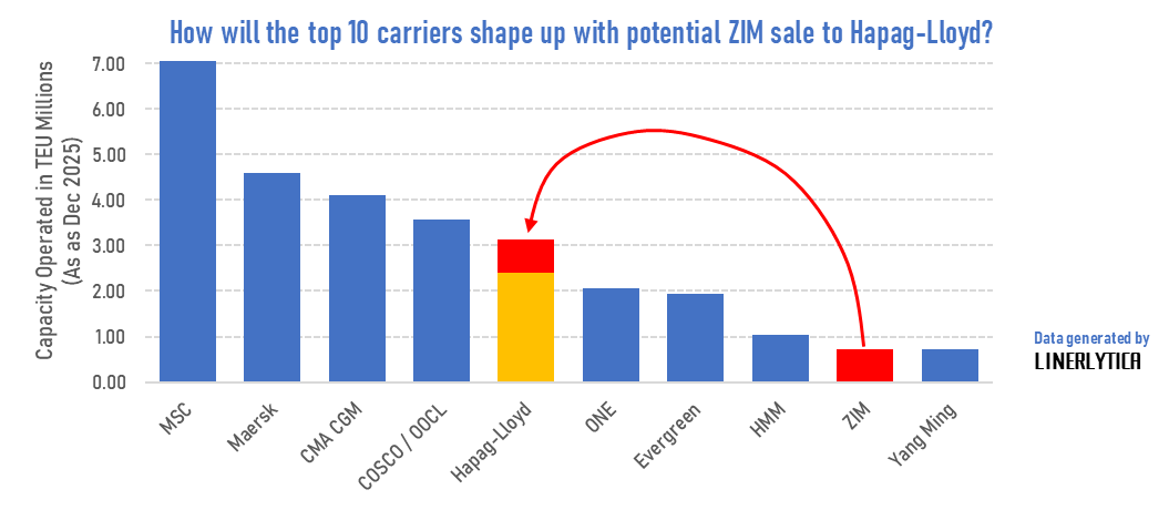 ZIM’s workers’ union has opposed Hapag-Lloyd’s bid due to Qatar (12.3%) and Saudi Arabia (10.2%) stake in the company, citing national security risks. The Israeli government holds a golden share in ZIM and the company is required to provide part of its fleet for the government’s use when required. The combination of Hapag-Lloyd and ZIM will not alter the Top 10 carrier rankings, with Hapag-Lloyd retaining its 5th spot but will allow it to narrow the gap with the Top 4.