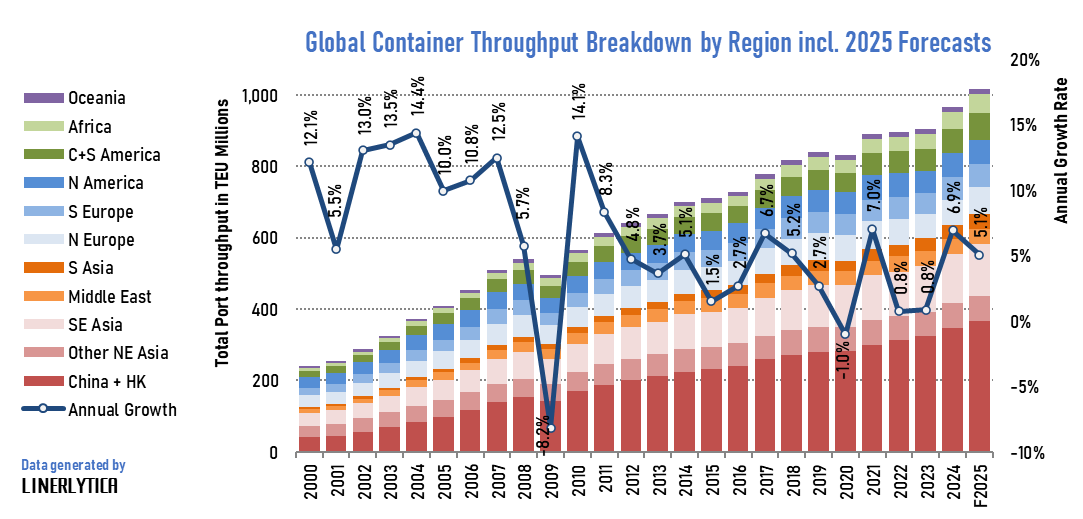 Global container throughput is on course to exceed 1 Bn TEU for the first time in 2025 with continued expansion of container volumes in the 2nd half of the year despite US tariff tensions. Full year growth will exceed 5.1% driven by strong Chinese container exports outside of the US, with exports to Europe, Latin America, Africa and India/Middle East all powering ahead while the China-US trade decoupling also drove strong volumes growth in Southeast Asia. 2026 growth is expected to weaken to 2.1% due to uneven global demand amidst slowing cargo demand momentum.