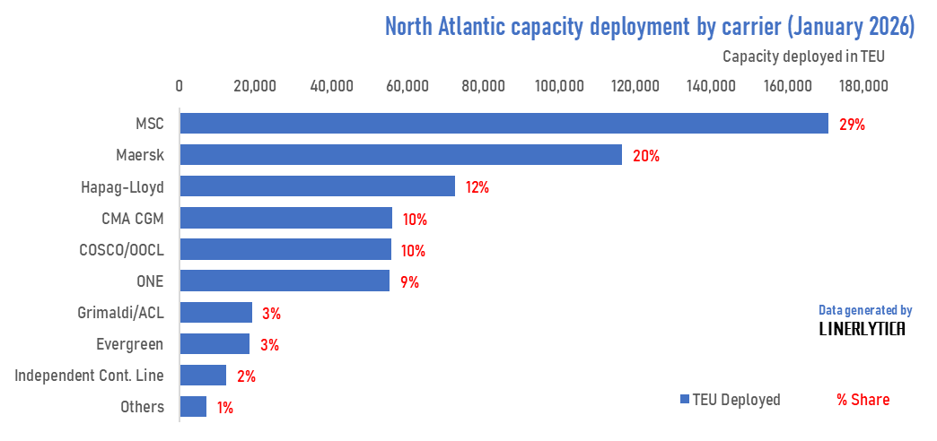 Trump announced on 17 January that eight European countries would face increasing tariffs starting at 10% on 1 February and rising to 25% on 1 June. The tariffs target Denmark, Norway, Sweden, France, Germany, United Kingdom, Netherlands and Finland if a deal is not reached on Greenland. Transatlantic container imports from North Europe to the US grew by 5.9% in 2025, but growth was already slowing in December and could be further hit by the new tariffs. The 4 main European carriers control 71% of the total capacity deployed on the North Atlantic route and would be the most badly affected by the potential fallout.