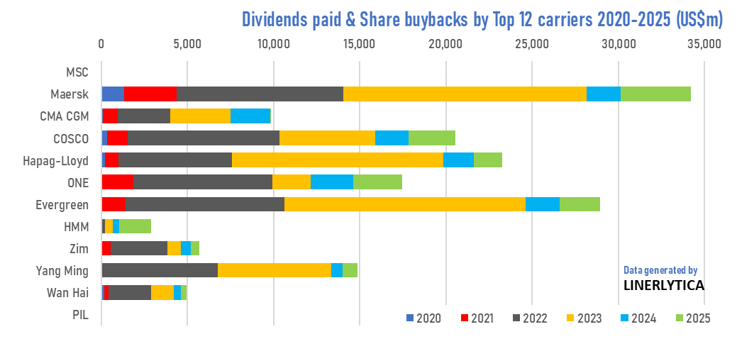 10 of the top 12 carriers have paid back over $160 Bn to their shareholders since 2020 through outsized dividend payments and share buybacks but the cash windfall would soon dry up as the container shipping super-cycle comes to an end. ONE reported an operating loss of $84m and net loss of $88m in the 4th quarter of 2025, with Maersk and Hapag-Lloyd also expected to report negative operating profit figures for their liner shipping business units when their results are announced later this week.