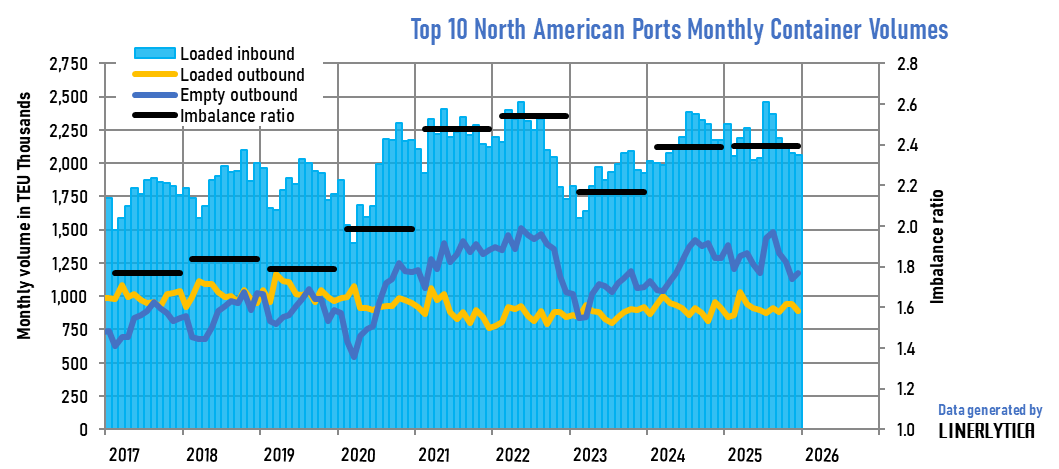 The US container trade deficit continued to widen in 2025 despite the Trump tariffs with laden exports falling by -0.2% while imports grew marginally by 0.1%. Outbound empty container moves increased by 3.5% to 10.9m TEU at the 10 largest North American ports as the US container imbalance ratio remains at a post-pandemic high of 2.4 times. Early estimates of January volumes show declines in both container imports and exports with the removal of the IEEPA tariffs by the US Supreme Court expected to do little to reverse the imbalance in the absence of a coherent trade policy.