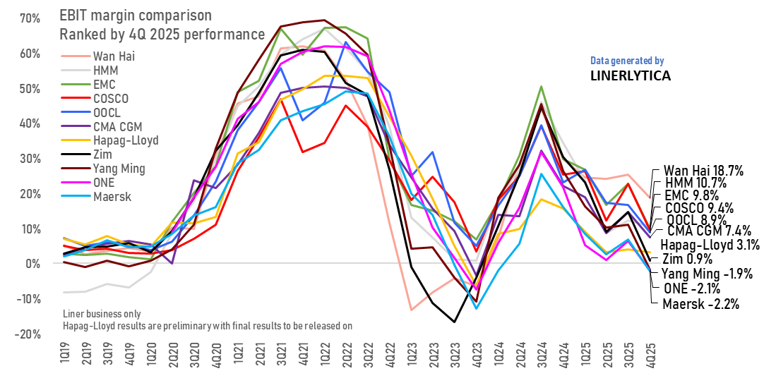 Maersk continues to underperform the rest of its peers in the 4th quarter of 2025, coming at the bottom of the EBIT margin performance of 11 of the largest publicly listed liner shipping operators. Maersk was 1 of just 3 carriers that recorded negative EBIT in the quarter, with the other carriers maintaining positive operating profits from their container shipping operations although average margins dropped to 5.7% in the 4th quarter compared to 14.3% in the 3rd quarter.