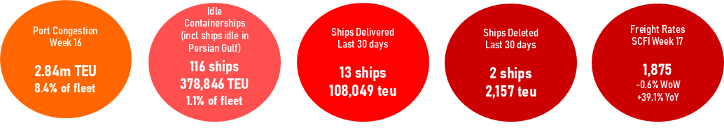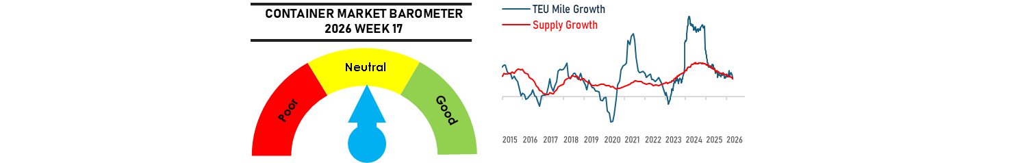Container freight rates have stabilized since the initial Iran war rate surge, with current gains largely coming higher bunker surcharges. Vessel capacity has adjusted rapidly with no space shortages reported and port congestion have been largely limited to Indian subcontinent and Arabian Sea ports. MSC only managed to evacuate 4 ships from the Gulf on 18 April with 2 more ships detained by Iran. Although the Hormuz remains effectively shut, 3 non-Iranian containerships made their passage out over the past week, including Hapag-Lloyd’s 4,253 teu TEMA EXPRESS, along with the 4,350 teu GFS GENESIS and 1,831 teu CSTAR VOYAGER.