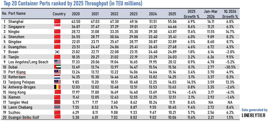 Containerised cargo volumes weathered the Middle East storm relatively unscathed in the 1st quarter of 2026, with total throughput at the Top 20 ports growing by 4%, led by strong growth at Chinese ports which account for half of the ports in the list. Ningbo overtook Singapore to rise to 2nd place for the first time, with volumes growing by 14.7% during the first 3 months of 2026. Dubai suffered a 30.5% fall in container volumes as vessel traffic was effectively halted in March due to the closure of the Strait of Hormuz, while Los Angeles/Long Beach volumes also declined by 5.2% due to the negative impact of the Trump tariffs. Port Klang rose by 1 spot to reach number 10, while Tanjung Pelepas rose by 2 spots to follow at number 11 as the 2 Malaysian ports rode on strong regional cargo demand to hit new handling records.